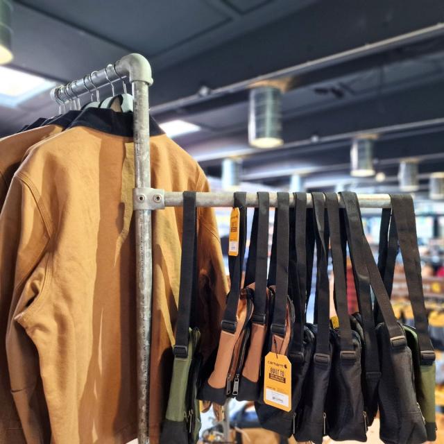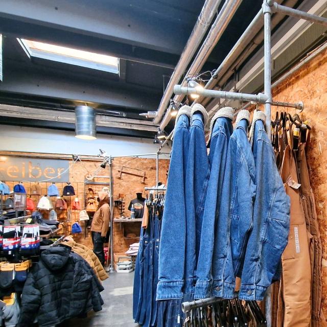Feibers showroom på Avedøreholmen i Hvidovre emmer af rå og industriel stemning. Fokus er på kvalitet og holdbarhed i såvel det store udvalg af arbejdstøj og i indretningen. Tøjstativer, borddisplays, hylder, bøjlestænger m.m. er bygget af og samlet med Clarrods Clamps fittings og rør.